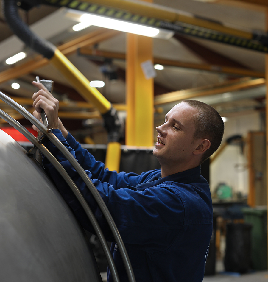 Din løsning bliver produceret her hos os. Vi har produktion samme sted som udvikling, så klejnsmedene kan bidrage med deres viden om processer og materialer. Og der er heller ikke langt til ingeniørerne og tegnerne, hvis der er detaljer, der skal afklares eller afprøves undervejs i udvikling og produktion.